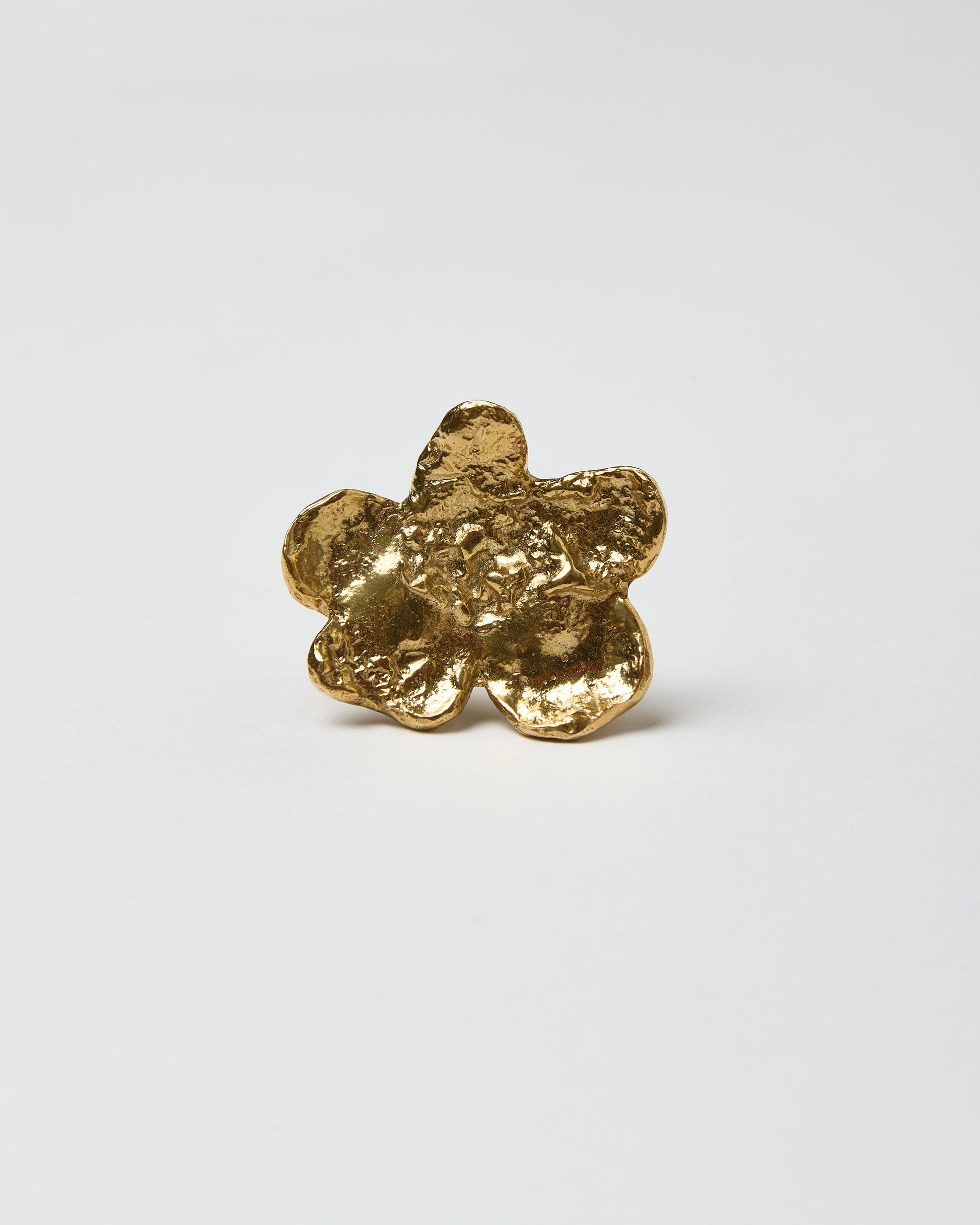 Anillo con forma orgánica de flor y superficie texturizada. Hecho a mano en bronce con enchapado en oro de 24 quilates.
